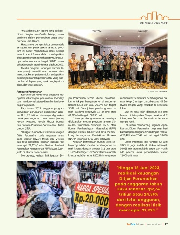 “Hingga 12 Juni 2023, realisasi keuangan dengan realisasi 88.389 unit serta mendu- bantuan pembangunan PSU dengan realisa-